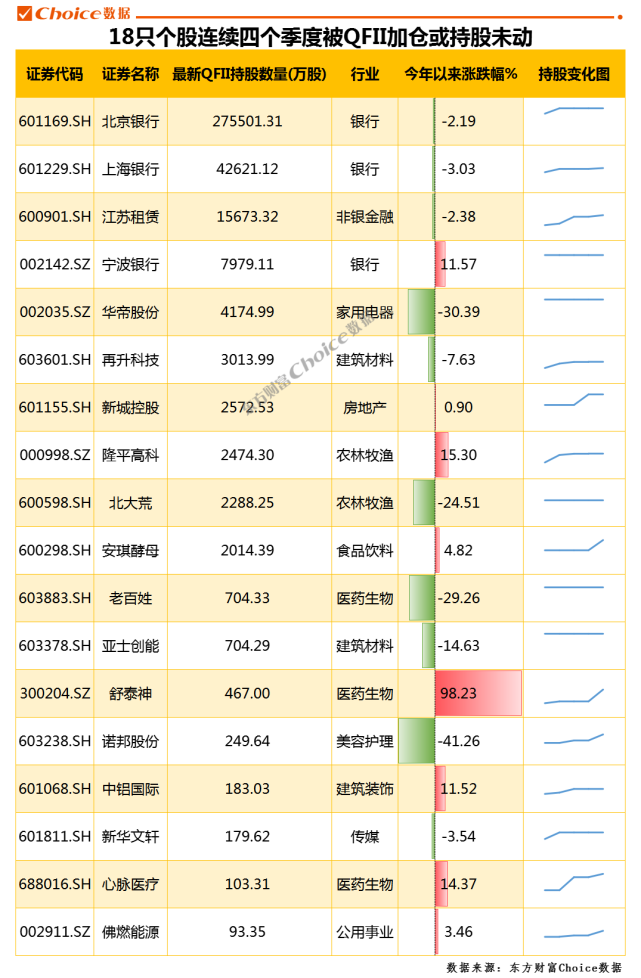 共18只个股被QFII连续四季度加仓或持股不动。这些个股以银行和医药生物和农林牧渔为主。其中,QFII持有北京银行、上海银行、宁波银行、中铝国际和新华文轩连续4个季度无变动;安琪酵母和诺邦股份被持续加仓,今年以来涨幅居前的有舒泰神、隆平高科和心脉医疗。