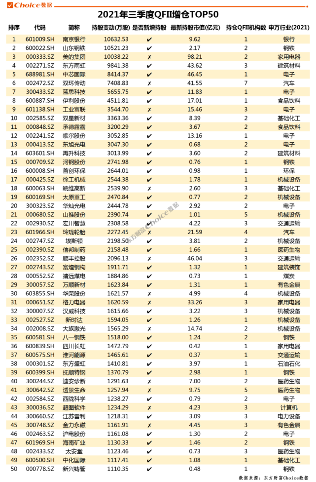 三季度QFII基金增仓股TOP50中,共37只个股为QFII三季度最新配置。