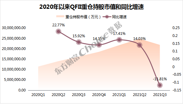 不过,QFII重仓持股市值下降11.81%,近一年来重仓持股市值首次出现下跌,重仓持股市值大幅下滑292.72亿元,2021年三季度最新重仓持股市值2186.1亿。