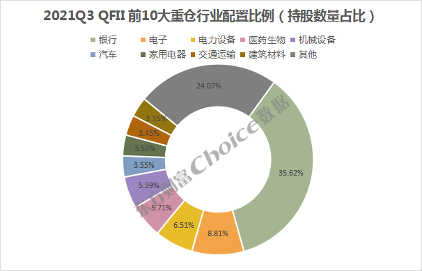 与险资还有社保基金动辄超50%配比银行的风格相比,QFII配置银行的比例较低,东方财富Choice数据统计显示,QFII三季度最新银行配置比例仅35.62%,对电子、电力设备、医药生物、机械设备四大行业配置超5%,风格较为积极主动,青睐未来前景较好、景气度高的行业。