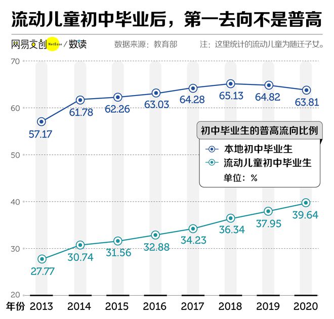 根据教育部统计数据,整体来看,相比本地初中毕业生超过六成上普高的比例,流动儿童能升读普高的比例一直以来都不到40%。