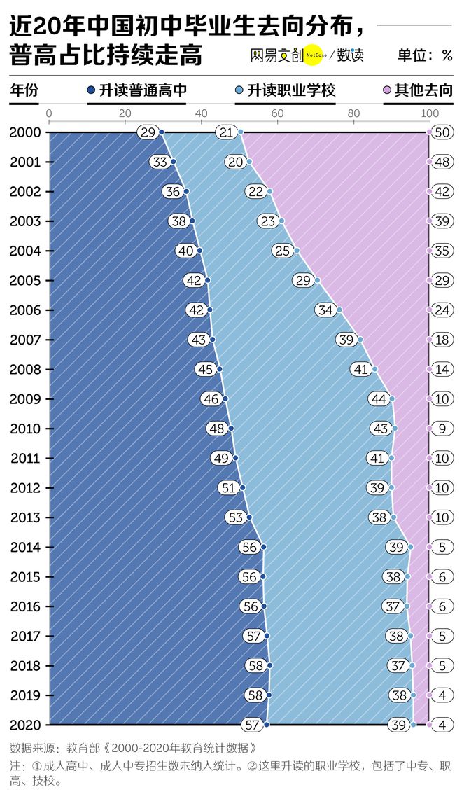 不论是普高,还是中职,在20年前,能接受高中阶段教育的人都不多。2000年时,中国只有29% 的初中毕业生能读普通高中,21% 的人能读职业学校。到了2020年,普高录取率已经达到57%,职业学校的招生比例也稳定在39% 左右。