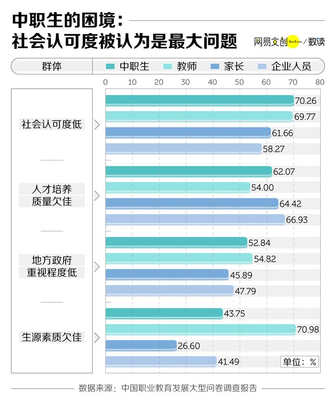 光明日报旗下的《教育家》杂志,曾联合相关教科院进行了一项样本量约10万人的问卷调查,70.26% 的中职生认为职业教育最大的问题是“社会认可度低”。