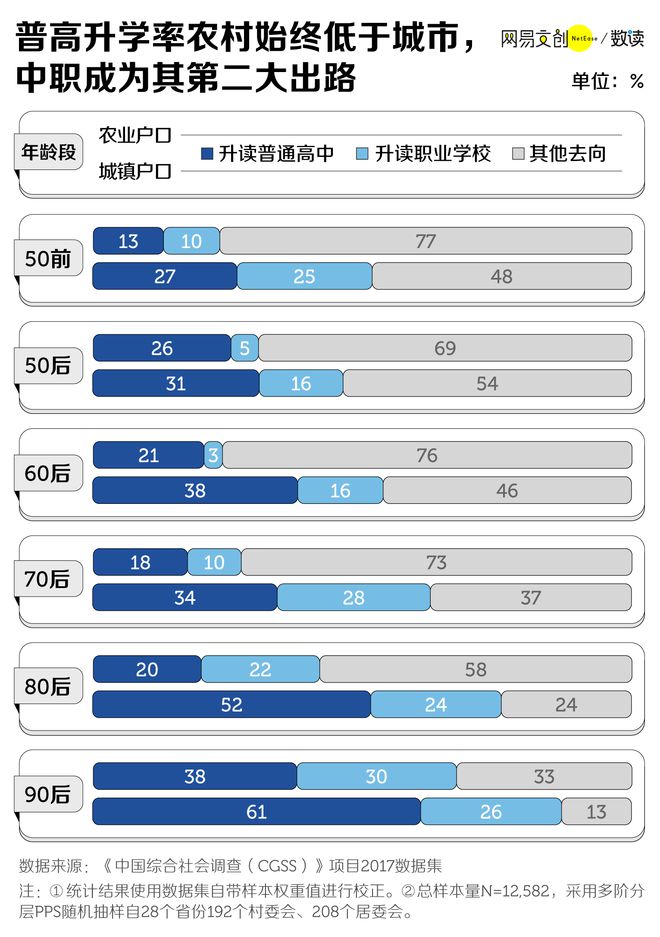 农村小孩接受高中阶段教育的机会始终少于城市。中国综合社会调查(CGSS)2017年的数据显示,长期以来,绝大多数农村学子在九年义务教育之后,就步入了社会,这种情况直到90后这一代才有所改观。