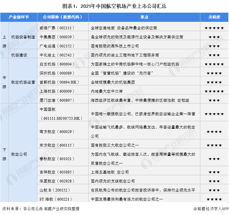 航空机场是航空运输业的一个分支,航空机场是指机场向旅客或航空公司等服务对象提供的服务活动。目前,我国航空机场产业的上市公司数量相对较少,主要集中在产业链中下游环节。具体包括,机场设备制造上市公司:威海广泰(002111)、中集集团(000039)、广电运通(002152);机场建设上市公司:中化岩土(002542);航空机场运营上市公司:白云机场(600004)、深圳机场(000089)、首都机场(00694.HK)、上海机场(600009)、厦门空港(600897);航空上市公司:中国国航(601111.SH/00753.HK)、南方航空(600029)、东方航空(600115)、春秋航空(601021)、吉祥航空(603885)、华夏航空(002928)、山航B(200152)、ST海航(600221)。