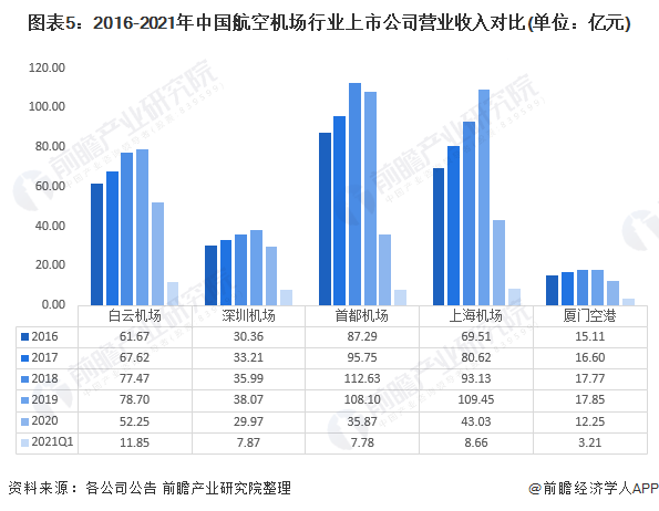 从航空机场行业上市公司营业收入上看,首都机场营业收入较高,但在2018年以后,上海机场营收超过首都机场,越居航空机场上市企业营收首位。2020年,受疫情影响,我国航空机场行业上市公司营收均大幅下降,首都机场、上海机场下降幅度较大。2020年,白云机场、深圳机场、首都机场、上海机场、厦门空港营收分别为52.25亿元、29.97亿元、35.87亿元、43.03亿元、12.25亿元,2021年第一季度,5家航空机场上市企业营收分别为11.85亿元、7.87亿元、7.78亿元、8.66亿元、3.21亿元。