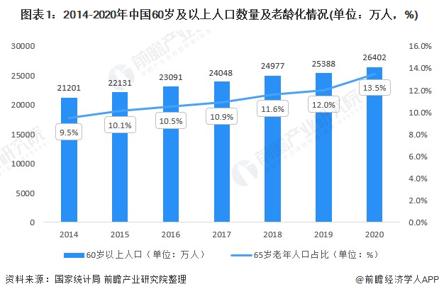 根据国家统计局数据显示,2014-2020年,我国老龄人口从2.1亿增加至2.64亿,年复合增长率达到3.72%;2020年60岁以上的人口达到2.64亿,占总人口比重为18.70%,其中65岁人口占比13.5%。中国早已经步入老年社会。