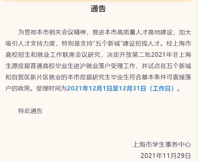11月29日,上海市学生事务中心官微发布通告称,决定放开第二批2021年非上海生源应届普通高校毕业生进沪就业落户受理工作,并试点在五个新城和自贸区新片区就业的本市应届研究生毕业生符合基本条件可直接落户的政策。