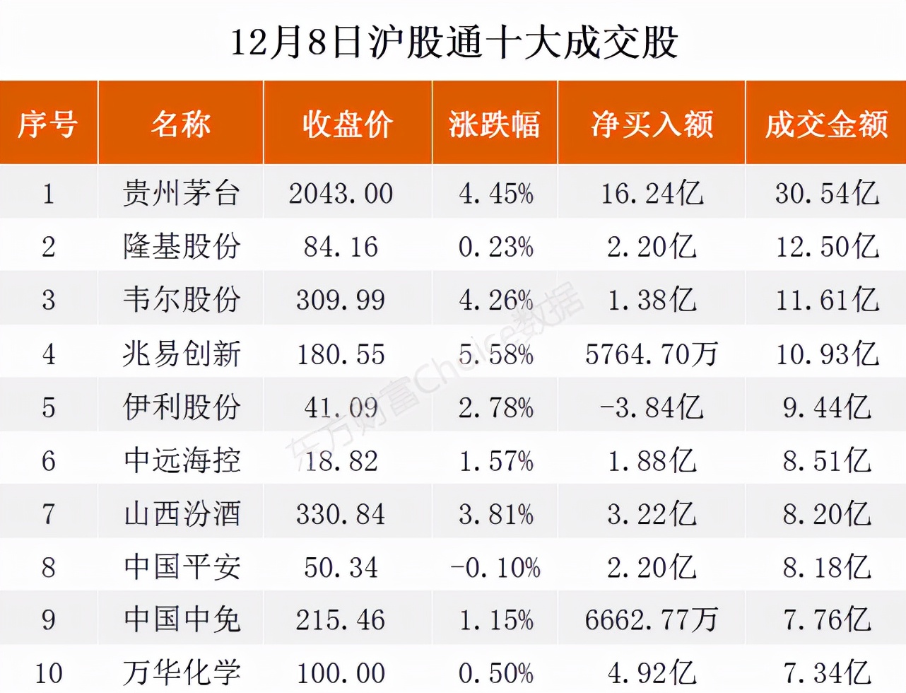 交易所公布的沪深港通十大成交股显示,当日北上资金大幅净买入贵州茅台16.24亿元,净买入洋河股份10.25亿元,净买入宁德时代12.74亿元,同时大幅净卖出伊利股份3.84亿元,净卖出立讯精密2.76亿元。