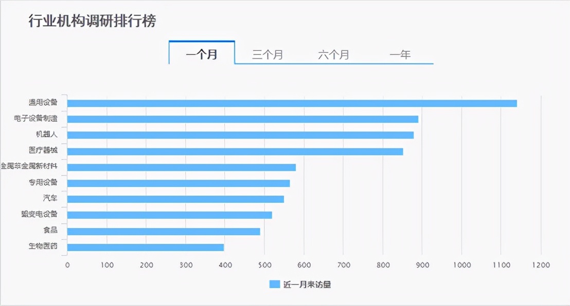 从近一个月的数据来看,通用设备行业的机构来访量最多,高达1166次,电子设备、机器人和医疗器械行业也有超800次机构来访量,科技创新仍是机构关注的重点方向。
