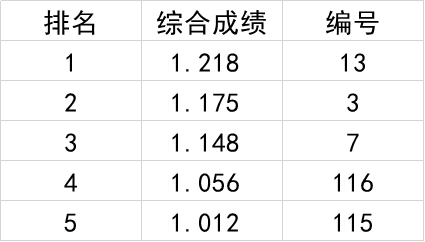 经过整理排序后可得出最终排名情况,下图为本次绩效考评中得分排在前五位的员工: