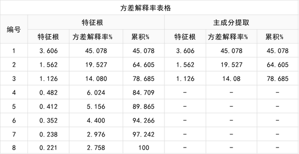 表2展示的是各因子的方差解释率和累积解释率结果,用于描述提取的因子个数以及分析每个因子方差解释率和累积总共方差解释率,每个因子方差解释率进行加权即得到权重值。