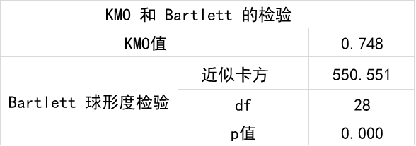 根据上表可知,KMO为0.748,大于0.6,满足因子分析的前提要求,意味着数据可用于因子分析研究。以及数据通过Bartlett 球形度检验(P<0.05),说明研究数据适合进行因子分析。
