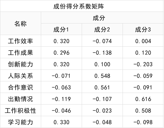 可以看到此时的因子对应关系较好,因子1主要与工作效率、工作成果、创新能力有较强的关联性。因子2与人际关系、合作意识有较强的关联性。因子3与出勤情况、工作积极性有较强的关联性。因此可以将因子1命名为工作能力因子,因子2命名为团队能力因子,因子3命名为工作态度因子。