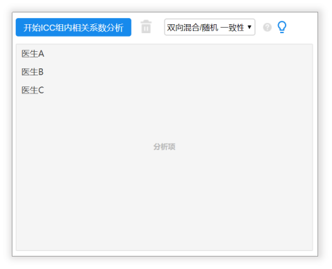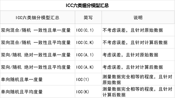 ICC组内相关系数可用于研究评价一致性,评价信度,测量复测信度(重测信度)等。相对于Kappa系数,ICC组内相关系数的适用范围更广,适用于定量或者定类数据,而且可针对双样本或者多样本进行分析一致性。但ICC的分析相对较为复杂,通常需要从三个方面进行分析并且选择最优的ICC模型;分别是模型选择,计算类型和度量标准。