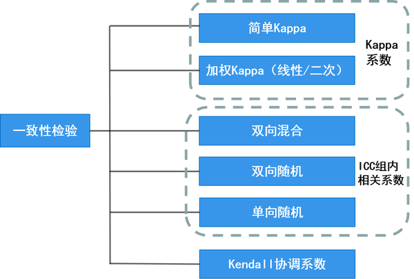 一致性检验的目的在于比较不同方法得到的结果是否具有一致性。检验一致性的方法有很多比如:Kappa检验、ICC组内相关系数、Kendall W协调系数等。每种方法的功能侧重,数据要求都略有不同: