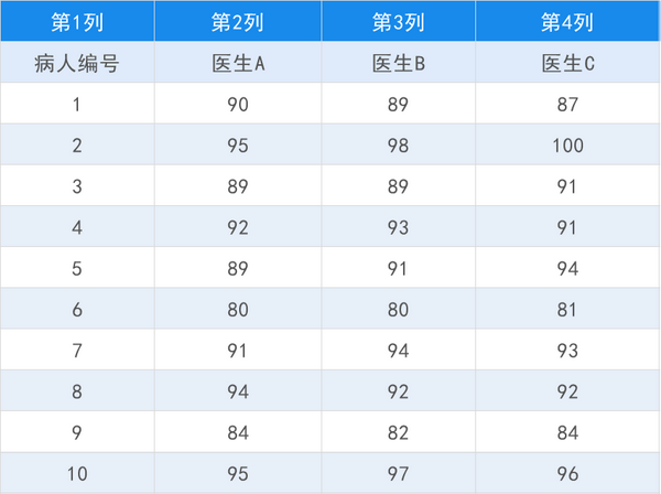 3个医生对于10个术后病人进行术后恢复评分;现在希望通过分析研究3个医生的打分一致性水平情况,使用ICC组内相关系数进行研究。录入后的ICC数据格式如下: