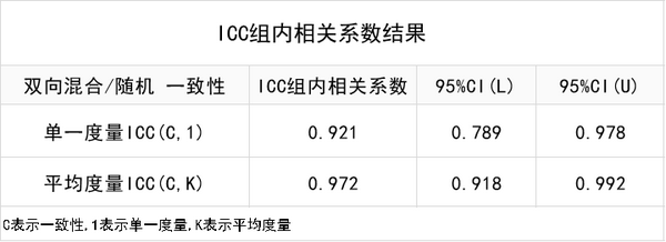 本次使用的是原始数据非计算后数据,因而使用单一度量标准结果即ICC(C,1),ICC组内相关系数=0.921,说明3位医生的评价具有高度一致性,也说明此次3名医生给出的打分有着非常高的可信性。