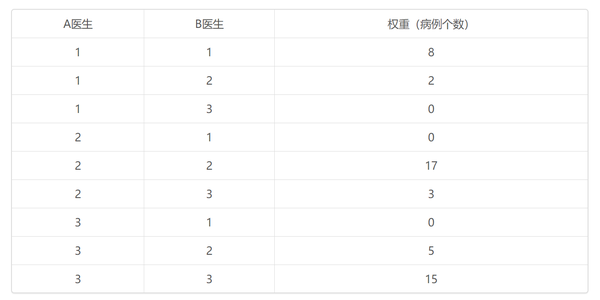 如果数据为等级式定类数据(比如轻度,中度,重度;也或者不同意,中立,同意);此时可使用加权(线性)Kappa系数。