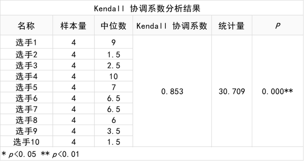 从上表可以看出:协调系数为0.853(P<0.01),大于0.8,说明4个评委的评分结果具有很强的一致性。