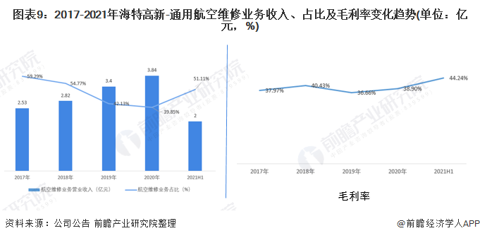 从通用航空维修业务的经营情况来看,2017-2020年,海特高新的通用航空维修业务收入呈不断上升态势。从通用航空维修业务收入占比来看,占比呈下降状态,但仍处于较高水平。结合2021年上半年数据来看,占比有所回升。2017-2021年上半年海特高新通用航空维修业务相应毛利率呈现波动上升态势且处于较高水平,高毛利率的原因在于航空维修的原材料成本较低,但维修技术性高,收入高。