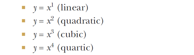 上面的只是一个2次项拟合的例子,我们其实经常会遇到有可能高次式会把数据拟合的更好,社科论文中其实也常常见到做高次回归的,常见的1次,2次,3次,4次项英文论文中的表达,曲线形状如下: