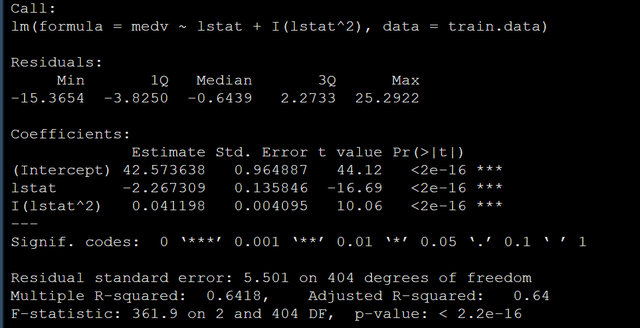 lm(medv ~ lstat + I(lstat^2), data = train.data)模型结果如下: