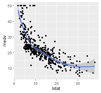 ggplot(train.data, aes(lstat, medv) ) + geom_point() + stat_smooth()