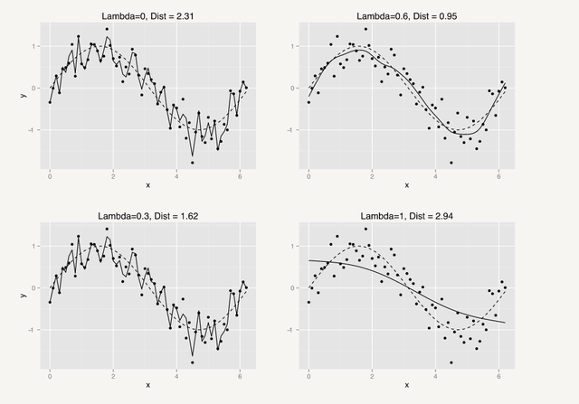 正则化则可以避免过拟合,可加模型是有一个超参λ的,这个超参决定了曲线的歪扭程度,英文叫做wiggliness,通过对超参的控制就可以很方便地实现方差偏差折中,见下图:
