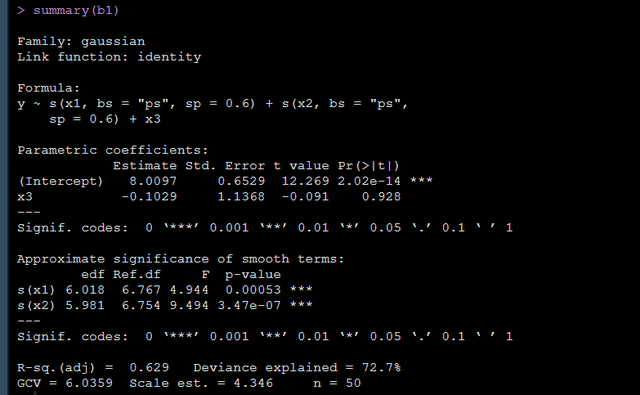 b1 <- gam(y ~ s(x1, bs='ps', sp=0.6) + s(x2, bs='ps', sp=0.6) + x3, data = dat)summary(b1)上面的代码中bs设定平滑方法,sp设定λ。