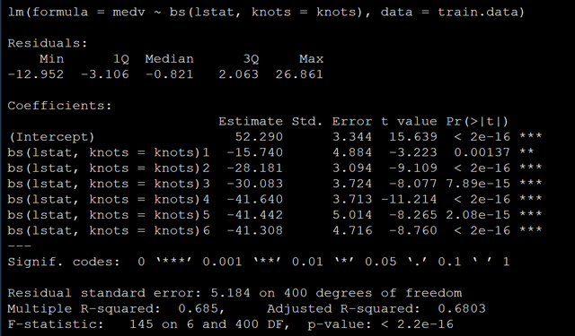 model <- lm (medv ~ bs(lstat, knots = knots), data = train.data)模型输出结果如下: