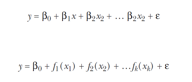 上面写的内容,无论是直接拟合,还是分段拟合,我们都是在拟合一个完整的曲线或直线方程,广义可加模型则是将自变量的单独模型相加,下图式子即为一般线性模型和可加模型: