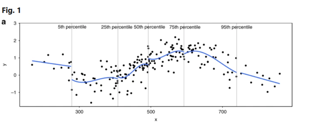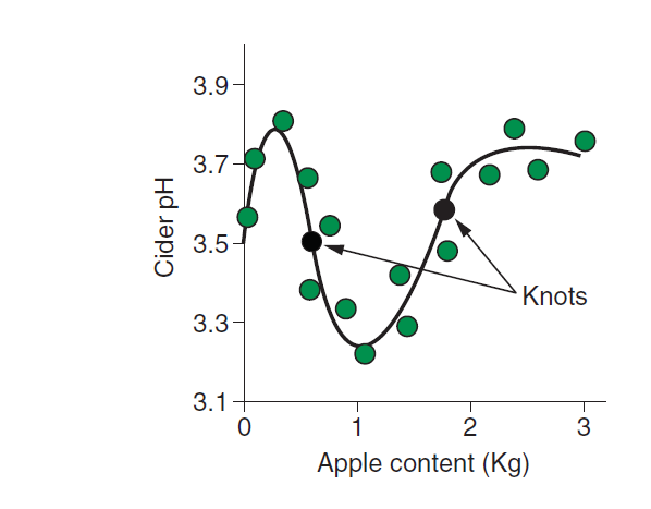 广义可加模型The number of knots used in the spline is determined by the user, but in practice we have found that generally five or fewer knots are sufficient. The location of the knots also needs to be specified by the user, but it is common that the knot with the smallest value is relatively close to the smallest value of the variable being modelled (e.g., the 5th percentile), while the largest knot is in the neighbourhood of the largest value of the variable being modelled (e.g., the 95th percentile).