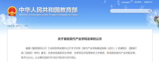 2020年8月份,教育部、工信部联合发布《现代产业学院建设指南(试行)》。2021年1月份,首批现代产业学院申报与建设工作正式启动——