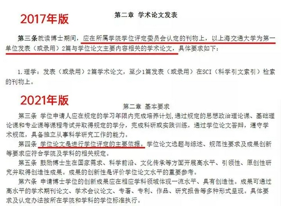 上海交通大学两个版本《关于申请授予博士学位的规定》对比