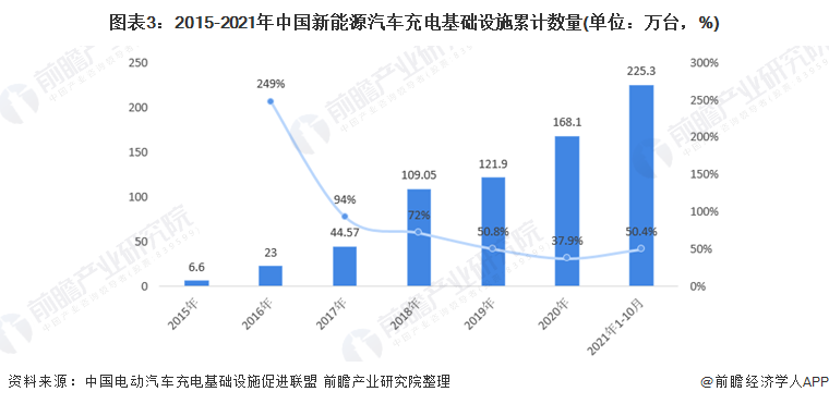 中国电动充电基础设施促进联盟数据显示,2015-2021年中国新能源汽车充电基础设施呈现逐年上升趋势,且每年至少保持两位数高增长率。截止2021年10月,全国充电基础设施累计数量为全国充电基础设施累计数量为225.3万台,同比增加50.4%,增速飞快的充电基础设施布局为互联网技术介入行业发展提供了广泛的发展基础。