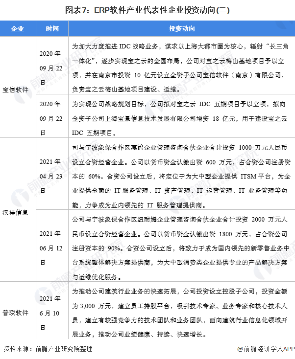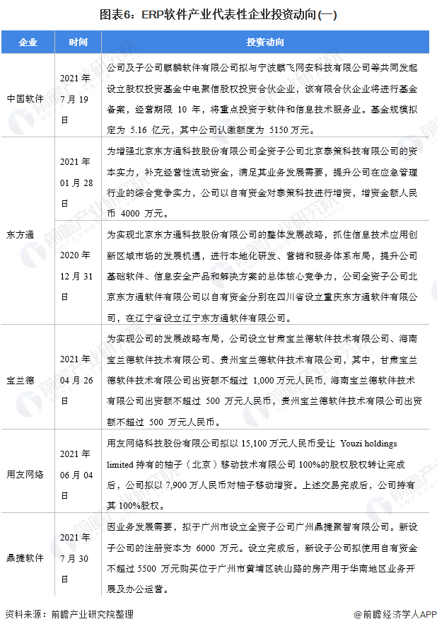 2021年以来,ERP软件产业代表性企业的投资动向主要包括收购公司拓展业务、通过对子公司增资的方式投资ERP软件生产研发项目。ERP软件产业代表性企业最新投资动向如下: