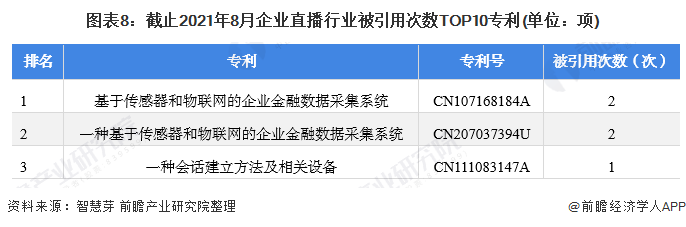 2021年1-8月,企业直播行业专利申请数量和专利授权数量分别为1项和0项,截止2021年8月21日,企业直播行业专利申请数量为21项。