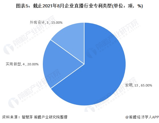 在专利类型方面,目前企业直播行业共有13项发明专利,占企业直播行业总专利申请数量最多,为65%。实用新型企业直播行业专利和外观设计型企业直播行业专利数量分别4项和3项,分别占企业直播行业专利申请数量的20%和15%。