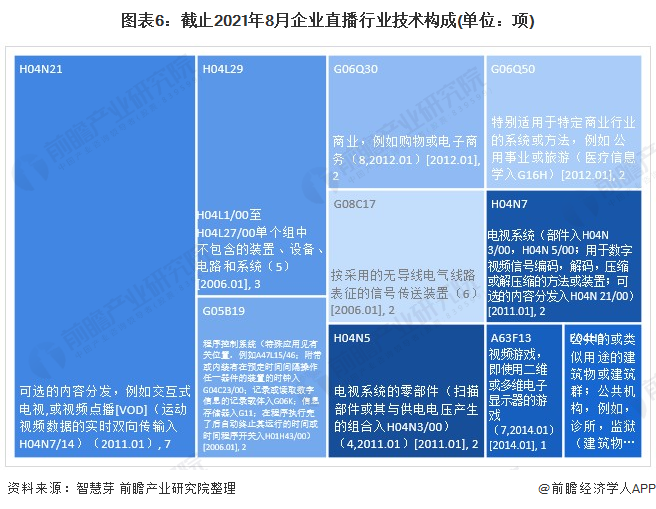 全文统计口径说明:1)搜索关键词:企业直播行业及与之相近似或相关关键词;2)搜索范围:标题、摘要和权利说明;3)筛选条件:简单同族申请去重、法律状态为实质审查、授权、PCT国际公布、PCT进入指定国(指定期),简单同族申请去重是按照受理局进行统计。4)统计截止日期:2021年8月21日。5)若有特殊统计口径会在图表下方备注。