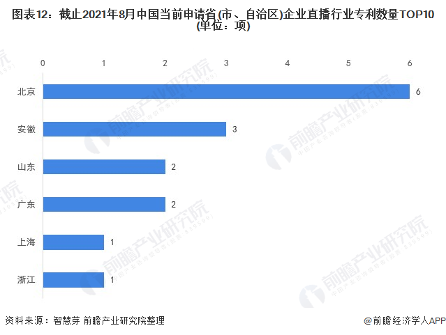 中国方面,北京为中国当前申请企业直播行业专利数量最多的省市,累计当前企业直播行业专利申请数量6项。其次为安徽当前申请企业直播行业专利数量3项。中国当前申请省(市、自治区)企业直播行业专利省份还有山东、上海、广东和浙江。