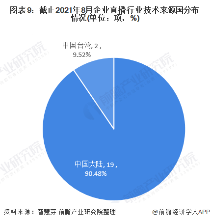 目前,企业直播行业第一大技术来源国为中国,中国企业直播行业专利申请量占全球企业直播行业专利总申请量100%;其中中国大陆专利申请量21项,占比90.48%,中国台湾专利申请量2项,企业直播行业专利申请量占全球企业直播行业专利总申请量的9.52%。