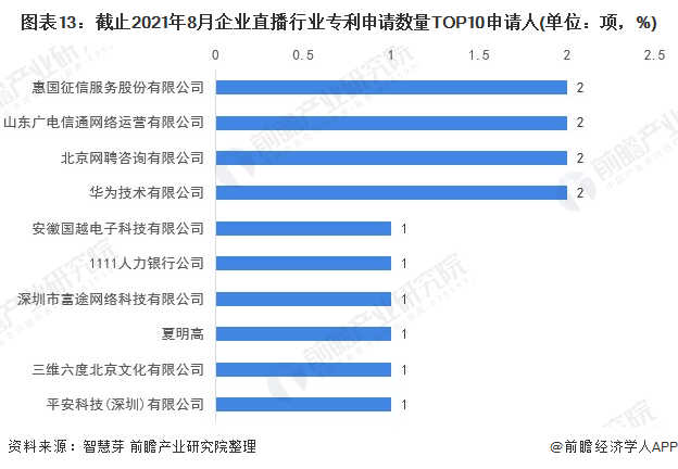 其中,惠国征信服务股份有限公司、山东广电信通网络运营有限公司、北京网聘咨询有限公司和华为技术有限公司企业直播行业专利申请数量均为2项。其他申请人申请数量均为1项。整体技术竞争不强。