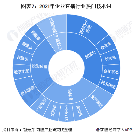 企业直播行业前十大热门技术词包括直播间、实体店、投影装置和扩散方法。进一步细分来看,企业直播行业技术热门词包括金融数据、生产数据、显示屏幕、图形用户界面等。具体情况如下: