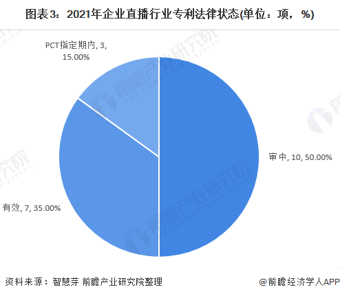 目前,企业直播行业大多数专利处于“审中”和“有效”状态,两者企业直播行业专利总量分别为10项和7项,占企业直播行业专利总量的50%和35%。PCT制定期内的企业直播行业专利数量为3项,占全球企业直播行业专利总量的15%。