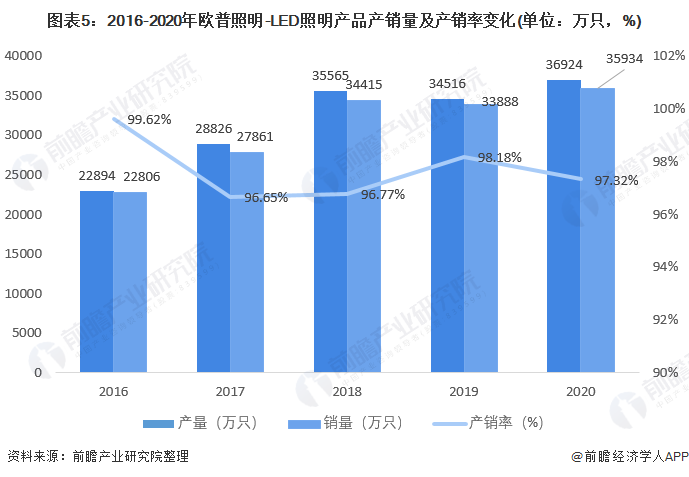 近几年,欧普照明致力于照明业务。从产销量来看,LED照明业务产销量总体呈现上升状态;从产销率来看,近几年产销率波动变化,但均处于较高水平,均在96%以上。2020年LED照明产品产量达到36924万只,销量达到35934万只,产销率达到97.32%,处于行业领先水平。
