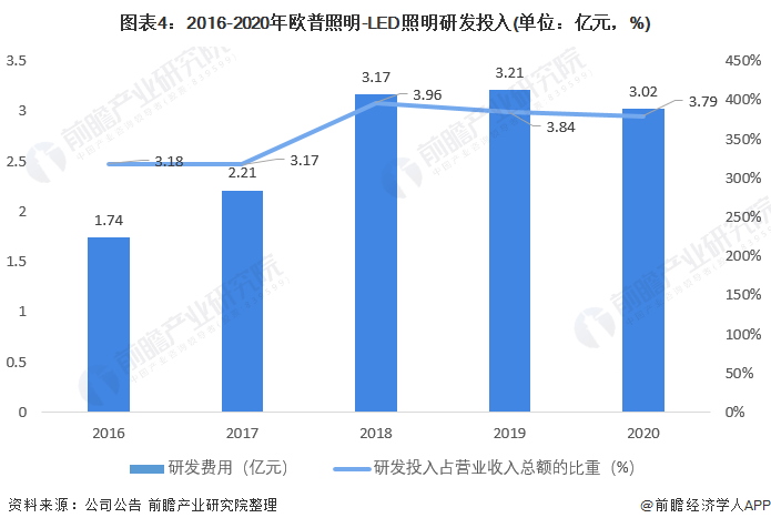 从欧普照明研发投入来看,近几年欧普照明研发投入基本呈现上升态势。2018-2020年研发投入均保持在3亿元以上,占比也均保持在3.8%左右。