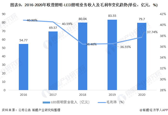 从LED照明业务的营业收入来看,2016-2019年,欧普照明LED照明业务呈现上升状态,但增速逐渐放缓。2020年受新冠疫情影响,欧普照明LED照明业务收入有所下降,达到79.7亿元。