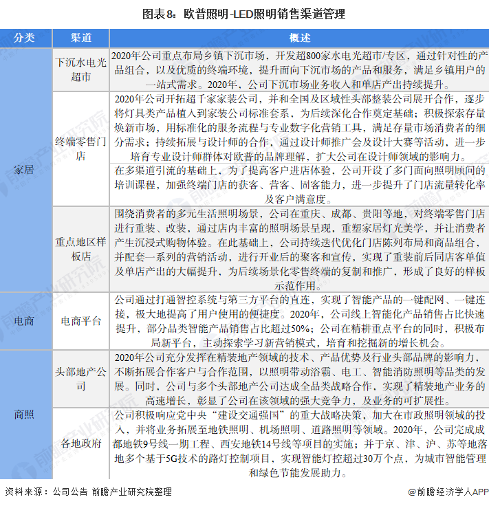 欧普照明根据不同的业务进行不同的销售渠道管理。从家居业务来看,主要渠道包括乡镇下沉市场、终端零售门店及重点地区样板店,通过开拓市场、增加门店及加强营销能力保证稳定的客流量及销售收入;从电商业务来看,除传统电商平台外,公司也在积极开拓新的电商平台;从商照业务来看,主要销售渠道及下游客户包括头部地产公司及各地政府。