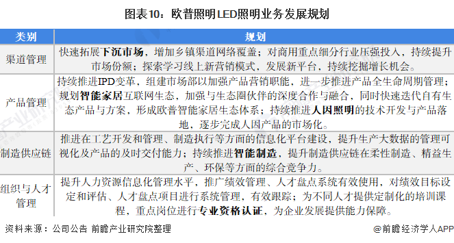 在2020年全球新冠疫情对欧普照明及其旗下子公司业务造成影响后,欧普照明从渠道、产品、供应链、组织与人才管理等方面对其业务进行了规划。渠道管理方面,欧普照明提出拓展下沉市场、提高商用照明市场份额及发展线上新营销等规划;产品管理方面,欧普照明提出要朝智能家居、人因照明等方向布局新产品;制造供应链方面,欧普照明将加快推进智能制造,提升产品及时交付能力;组织与人才管理方面,将进一步提升人力资源信息化管理水平并进行人才培训。